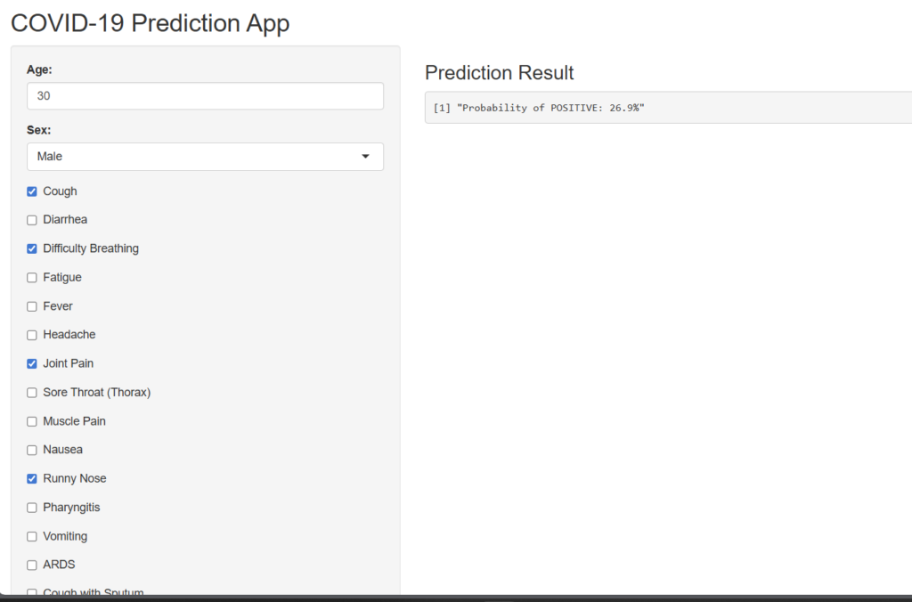 This predictive model serves as a valuable resource for individuals seeking to assess their risk of infection, enabling informed decisions regarding testing and seeking medical advice. Remember, while the app provides a probability score, it should not be used as a definitive diagnosis, and consulting a healthcare professional is always recommended if you exhibit symptoms.